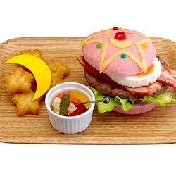 - Sailor Moon Special burger (розовый лунный бургер в форме броши СМ из 2 сезона. В составе - бекон, жареное яйцо, котлета, салат и др.+ картошка в форме звёзд и маринованные овощи) - 1600 йен;