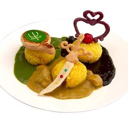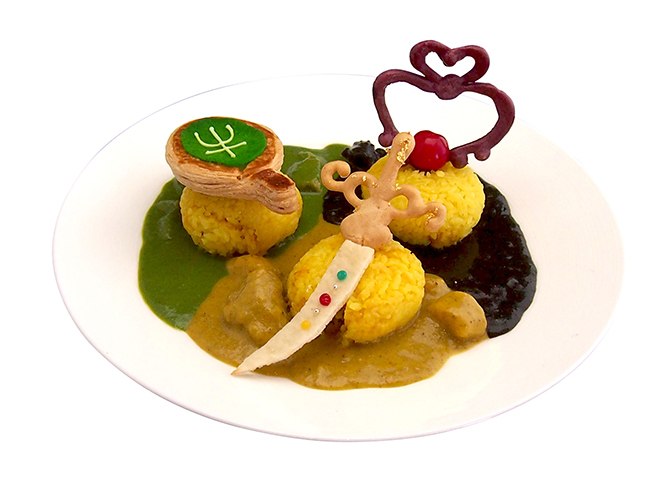 - 3 kinds of Talisman Curry: 3 вида карри с рисом в одной тарелке - по одному на внешнюю воительницу -украшенные съедобными талисманами. (Карри Уран - жёлтое, карри Нептун - шпинатное, карри Плутон - с чернилами кальмара.) Цена - 1450 йен;