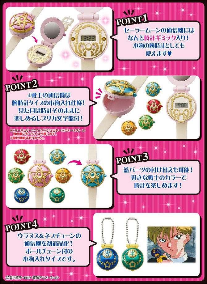 Вторым же анонсом стали часы-коммуникаторы сейлор-воинов, которые выйдут в форме гасяпонов. Вместе с ними будут выпущены переговорные устройства Уран и Нептун в виде брелоков. Этот коммуникатор имеет двойное назначение: как часы и как небольшой контейнер наподобие таблетниц, который расположен под часовой частью. Крышка на часах-коммуникаторе является съёмной и её можно заменить на крышку любимого воина-иннера, которые выйдут в отдельных капсулах.