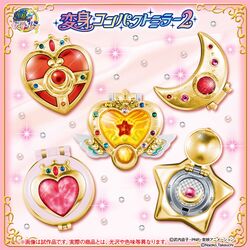 А 26 апреля "Bandai" после длительного перерыва анонсировали выход 2 комплекта гасяпонов брошек-зеркал. Они будут иметь роскошную отделку с металлическим покрытием, стразы, прозрачные части и многое другое. Размер каждого зеркальца - 5,5 см. Линейка будет выглядеть следующим образом:
