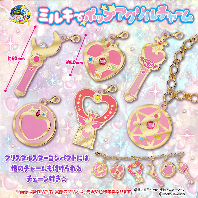Компания "Premium Bandai", занимающаяся выпуском продукции по СМ, анонсировала сразу 2 вида новых товаров. Первый - комплект подвесок-гасяпонов "Sailor Moon Milky Pop Acrylic Charms". Данные подвески выполнены из акрила и окрашены блестящей краской молочных цветов, а также украшены кристаллами. Подвеска в форме броши Кристальной Звезды выйдет вместе с золотой цепочкой-браслетом, предназначенной для подвесок. Модельный ряд подвесок выглядит следующим образом: