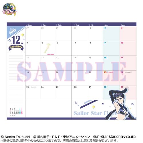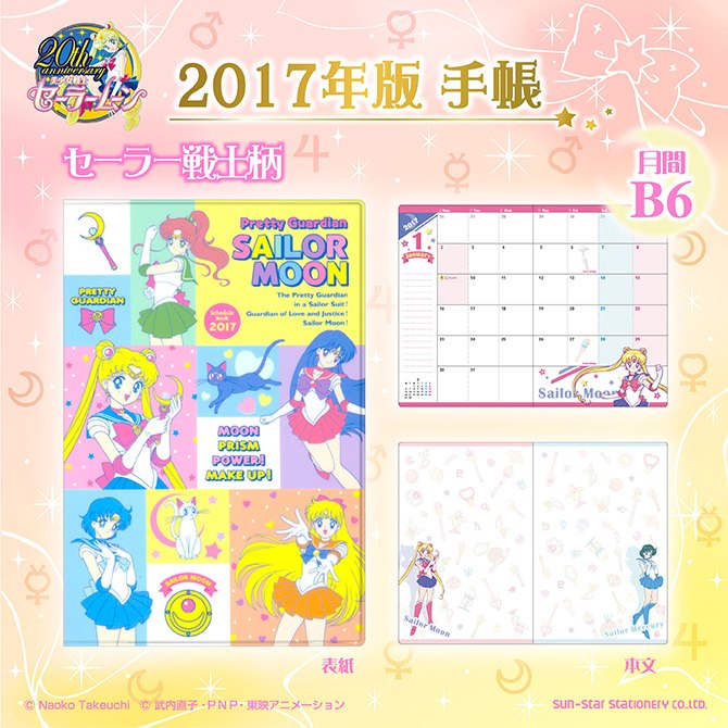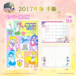 1 июля компания "Sun-Star Stationery", специализирующаяся на производстве канцелярской продукции, анонсировала выход двух ежедневников - с иннерами и Принцессой Серенити на обложках - размера В6. Обложки ежедневников будут изготовлены из винила, в каждом из них - 40 страниц. Обложка ежедневника с иннерами оформлена в пастельных тонах, арт представляет собой коллаж с девочками, Луной, Артемисом, предметами и речёвками. Странички в ежедневнике также оформлены в мягкой цветовой гамме, с фигурами девочек в нижних углах страниц, и узором из предметов. На обложке ежедневника с Серенити - силуэт принцессы в цветном флаконе для парфюма. Страницы в этой книжке - белого цвета, с узорами из стеклянных шаров, флаконов и др. предметов в их нижних углах. Датируются с января 2017 по март 2018 гг.