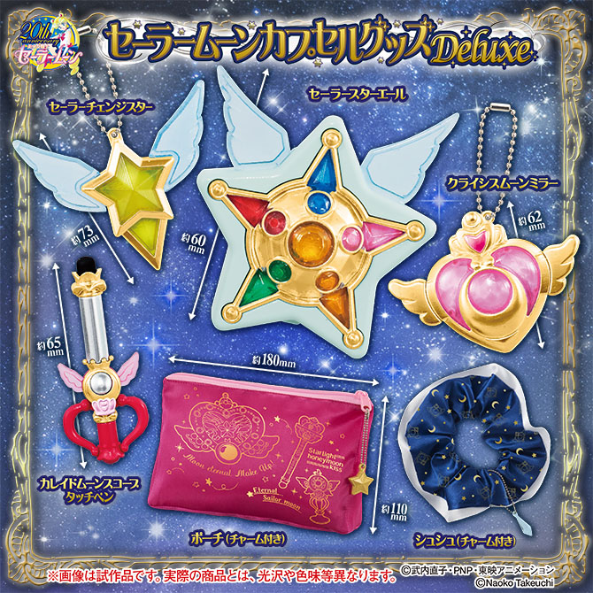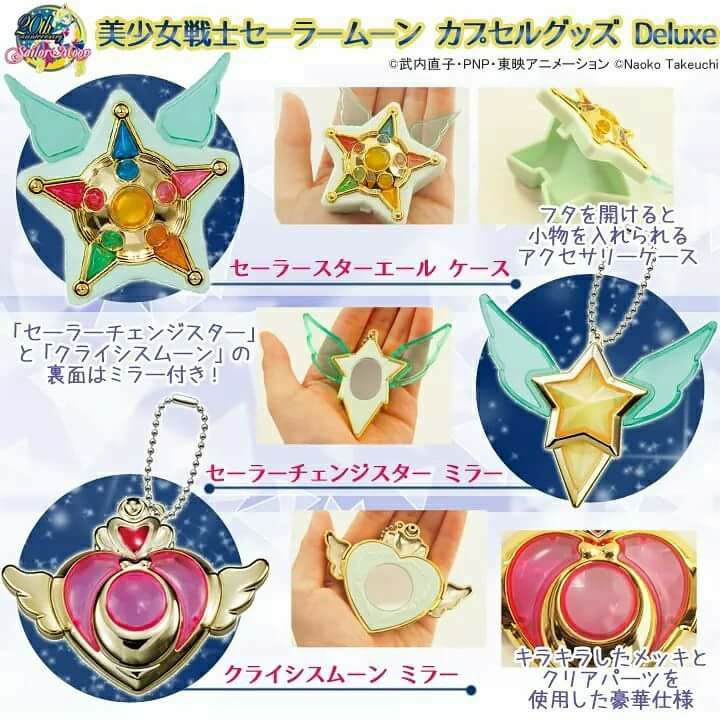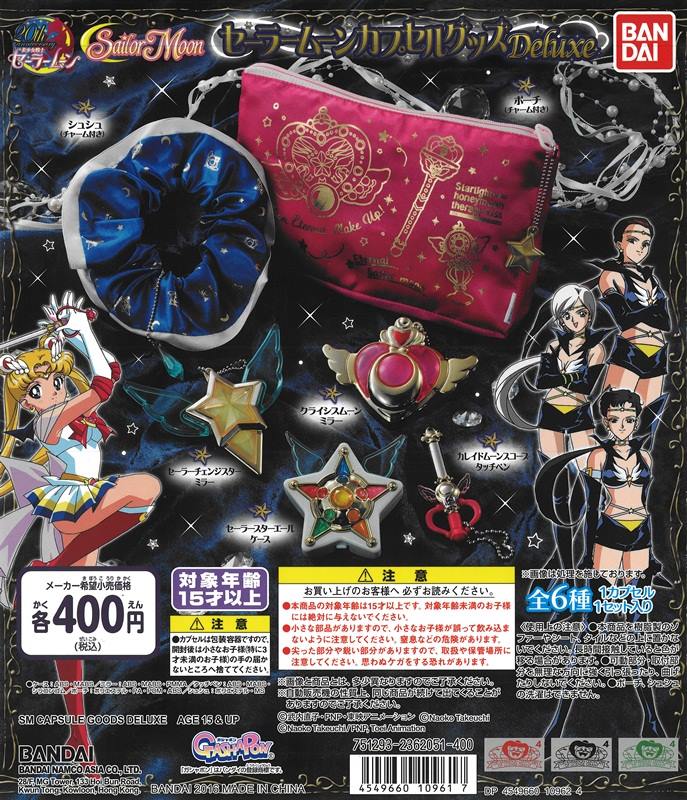 Новый набор гасяпонов, анонсированный сегодня, будет носить название "Sailor Moon Capsule Goods Deluxe", а тематика предметов будет связана с 4 и 5 сезонами СМ - SuperS и Sailor Stars. Линейка включает в себя 6 предметов: