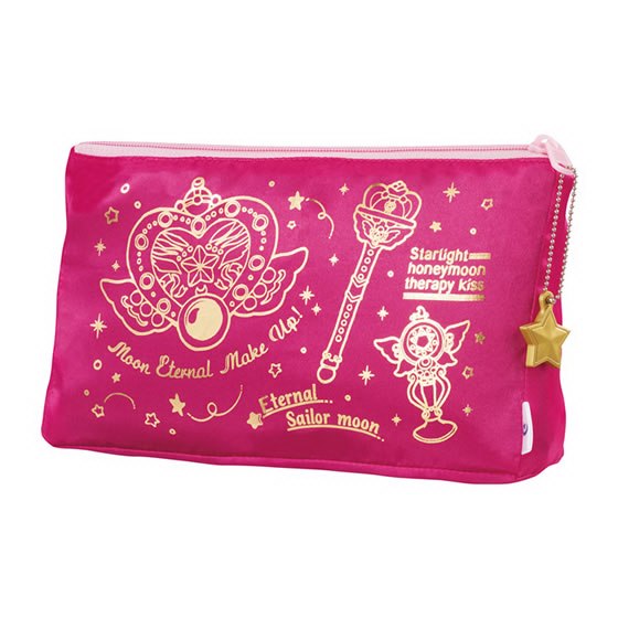 - Косметичка. Выполнена в розовом цвете и с золотыми узорами в форме предметов Сейлор Мун из 5 арки - броши, жезла и Радужной Лунной Чаши - и её фраз. К замку косметички прикреплена подвеска-шарм со звездой. Размер - 18 см. х 11 см.