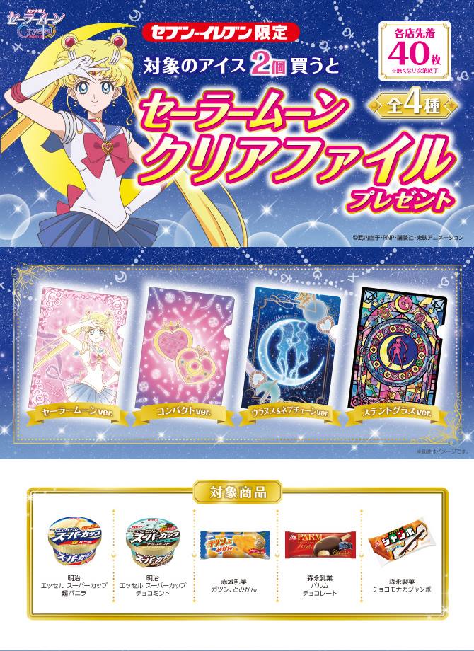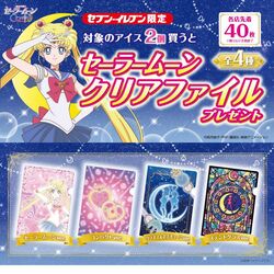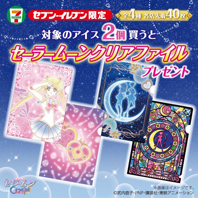 В тот же день было объявлено об очередном сотрудничестве "Sailor Moon Crystal": на этот раз - с магазинами "7-eleven" - с 5 августа, при покупке 2 любых видов мороженного из 5, можно получить одну из 4 папок формата А5: