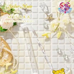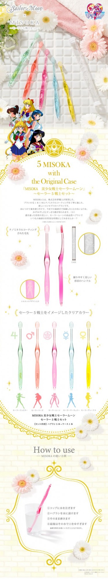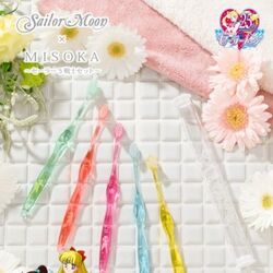 8 сентября появился анонс ещё об одном сотрудничестве СМ: на этот раз - с компанией "MISOKA", производящей зубные щётки, которым не нужна зубная паста - достаточно погрузить щётку в воду, чтобы её можно было использовать. Доступны будут 2 варианта щёток: комплект из 5 штук, оформленных в цвета "иннеров" + чехол и одна прозрачная щётка "Принцесса Серенити" + чехол.