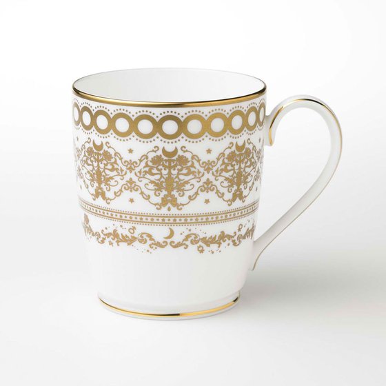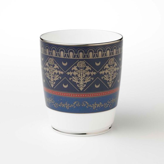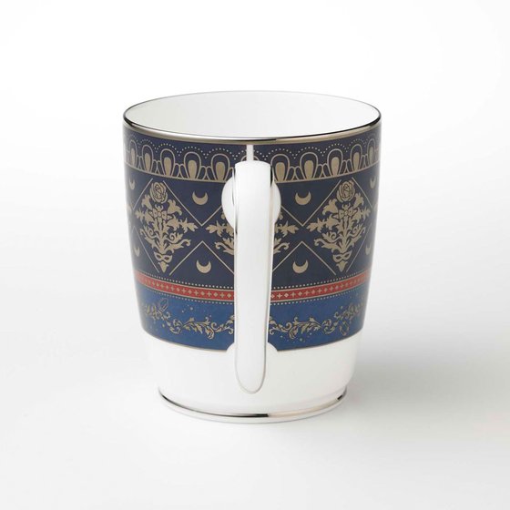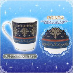 Кружка Принца будет почти целиком тёмно-синего цвета, с добавлением красного и орнаментами. в которых будут задействованы узоры в форме роз, масок, бантов-бабочек и кристаллов драгоценных камней.