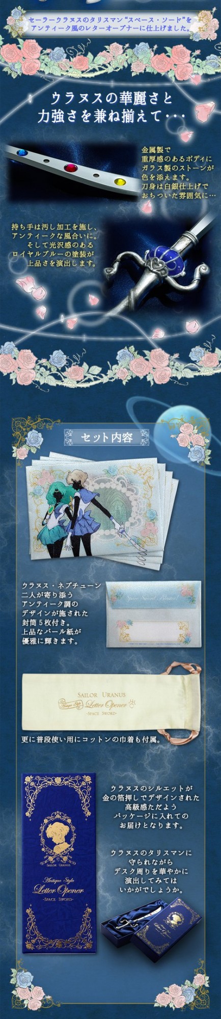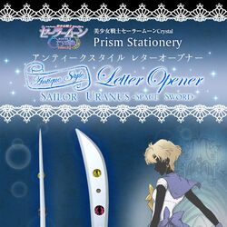 15 сентября компания "SunStar Stationary" анонсировала выход необычного продукта - им оказался нож для вскрытия писем талисман "Space Sword" Сейлор Уран из СМК. Данная вещица будет изготовлена из металла (цинка), лезвие украшено жёлтыми, красными и синими стразами (по 3 с каждой стороны) и имеет серебристо-белый цвет, рукоять выполнена "под старину". Длина ножа - 17 см, ширина - 4,2 см, высота - 1,7 см.