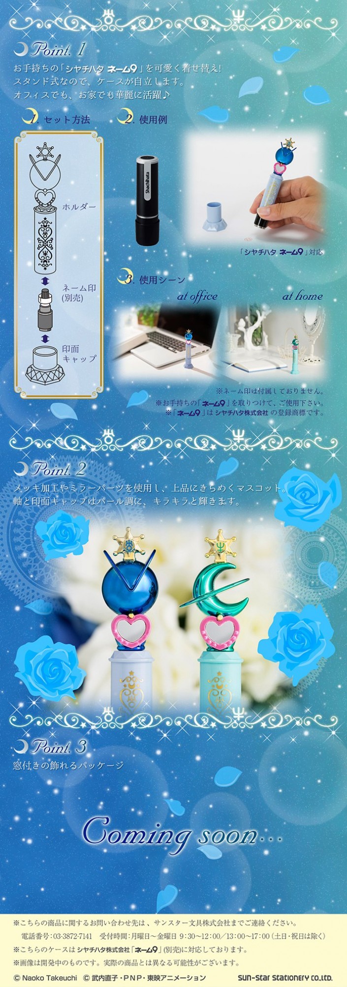 20 сентября "SunStar Stationary" анонсировала 2 кейс для именных печатей "Shachihata Name 9". Нынешний набор будет стилизован под жезлы Урана и Нептуна: они имеют синий и бирюзовый цвета, декорированы золотистым узором, а верхушки кейсов украшены блестящими навершиями жезлов воительниц.