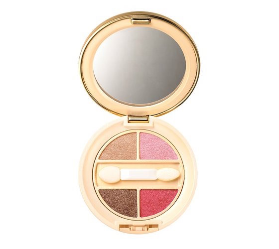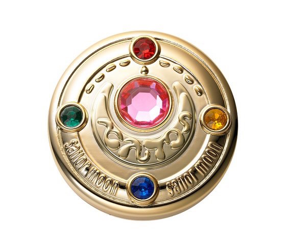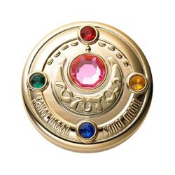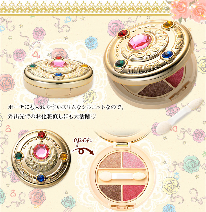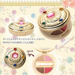 Во-вторых, к этой новости были прикреплены фото новых теней для век в форме первой броши СМ от "Creer Beaute", из линейки "Miracle Romance", которые получили название "Sailor Moon Prism Compact Makeup Eye Shadow". Брошь имеет блестящий золотой цвет и отделана стразами. Размер коробочки - 7 см. в диаметре и 2,5 см. в толщину,благодаря чему тени удобно носить с собой. Палетка содержит 4 варианта теней, из которых жемчужно-красные можно, также, использовать в качестве румян.