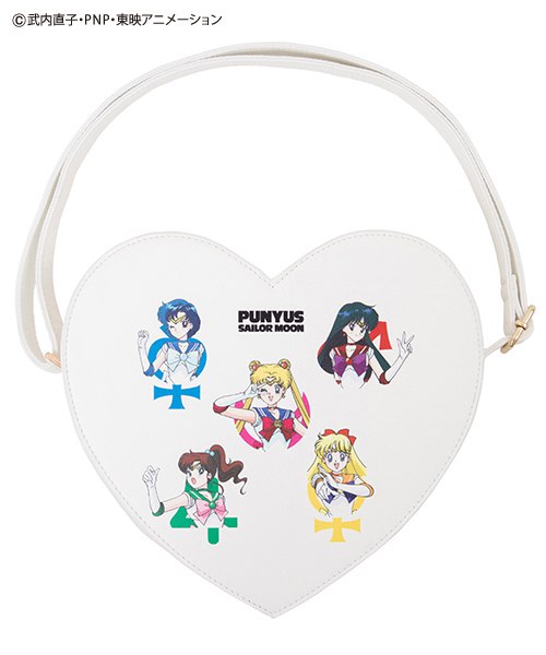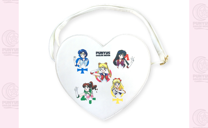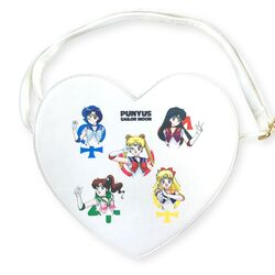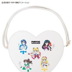 - Сумочка на плечо «Sailor Senshi Shoulder Heart Shaped Bag»: белого цвета. Выполнена в форме сердца. В качестве узора использован упоминавшийся выше - во 2, 3 и 4 пунктах - принт, изображающий «внутренних» сенши на фоне их знаков планет. Цена за сумочку – 4 990 йен.