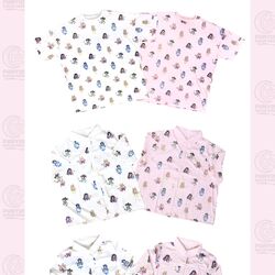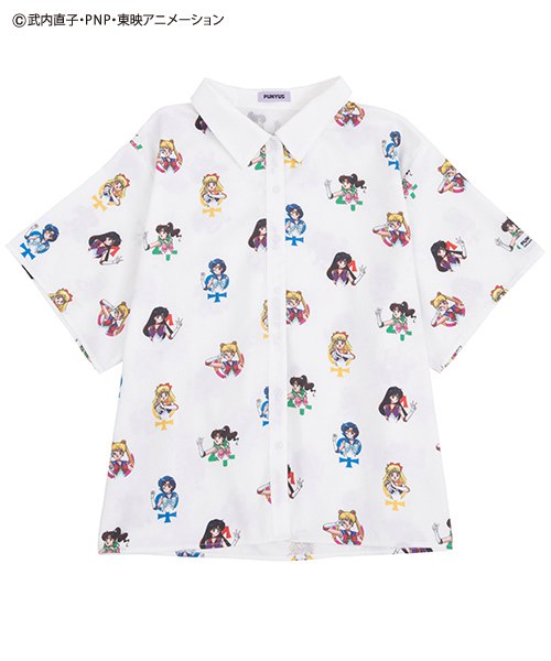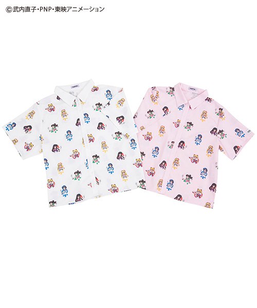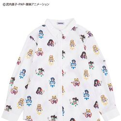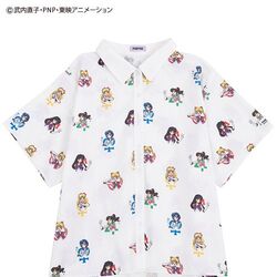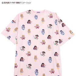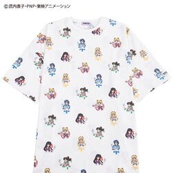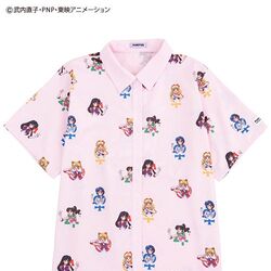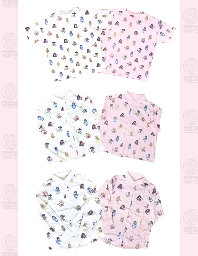 - Футболки и два вида рубашек «Sailor Senshi Pattern Print Short Sleeve/Shirt/Shirt»: футболки имеют короткие рукава, рубашки выйдут в 2 версиях – с короткими и длинными рукавами. Предметы одежды будут иметь 2 цветовых варианта: белый и розовый. Рисунок – изображения 5 «внутренних» сенши на фоне их символов планет (как на вышеописанных рубашках и комбинезонах). Цена за футболку с коротким рукавом – 3 990 йен. Цена за рубашку с коротким рукавом – 6 990 йен. Цена за рубашку с длинным рукавом – 6 990 йен.