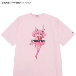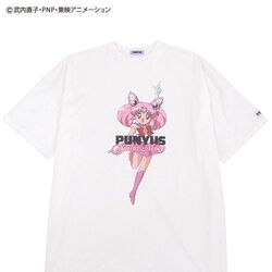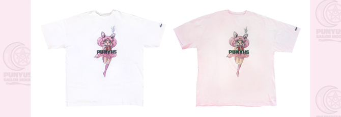 - Футболки с изображениями Сейлор Чибимун «Sailor Chibimoon T-shirt»: выйдут в 2 вариантах – белом и розовом. В центре футболки – фигура Чибимун с надписями «PUNYUS» и «Sailor Moon» поперёк неё. Цена за футболку – 3 990 йен.