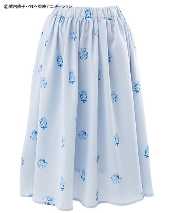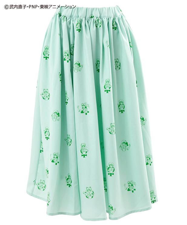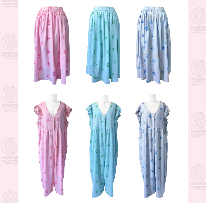 - Юбки и комбинезоны «Sailor Senshi Pattern Chiffon Skirt/Romper»: сделаны из шифона, придающего силуэту «воздушность». Представлены в 3 цветовых вариантах – розовом, голубом и светло-синем. В качестве узора, как и в предыдущих моделях, использованы маленькие изображения «внутренних» сейлор-воительниц на фоне их планетарных знаков, которые окрашены в близкие к основному цвета (ярко-розовый, бирюзово-зелёный, тёмно-синий соответственно). Цена за юбку – 5 990 йен. Цена за комбинезон – 7 990 йен.