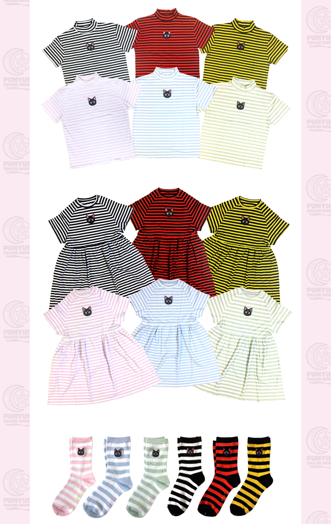- «Luna High Neck T-shirt/One Piece/Socks»: будет представлена 3 моделями - футболками с высоким воротом и короткими рукавами, платьями и носками – в 6 цветовых вариантах: чёрно-белом, чёрно-красном, чёрно-жёлтом, бело-розовом, бело-голубым, бело-серым. Украшены вышивкой в виде мордочки Луны. Цена за футболку – 3 990 йен. Цена за платье – 4 990 йен. Цена за пару носков – 1 590 йен.