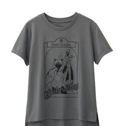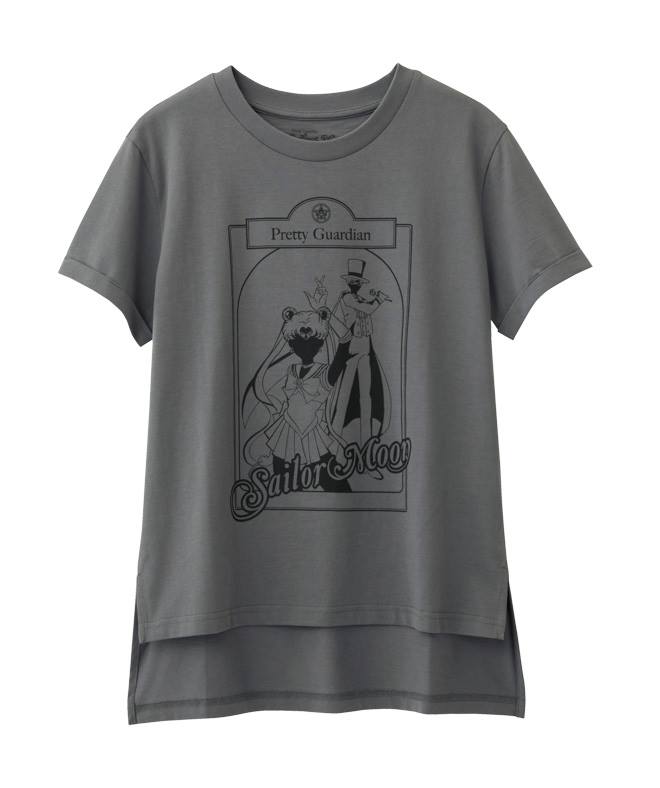 - Футболки«Sailor Moon Illustration Print T-shirt»: имеют 4 цвета и 2 вида принтов – тёмно-серая, тёмно-синяя, светло-серая и белая; силуэт Сейлор Мун на фоне полумесяца, в двойной рамке, силуэты СМ и Такседо Маска, также заключённые в двойную рамку. Тёмно-серая и тёмно-синяя футболки выйдут с принтом СМ и Такседо, светло-серая и белая – с принтом СМ. Как и футболки с фразами сенши, имеют удлиненный подол сзади. Цена – 790 йен.