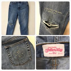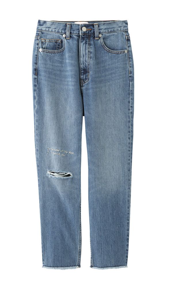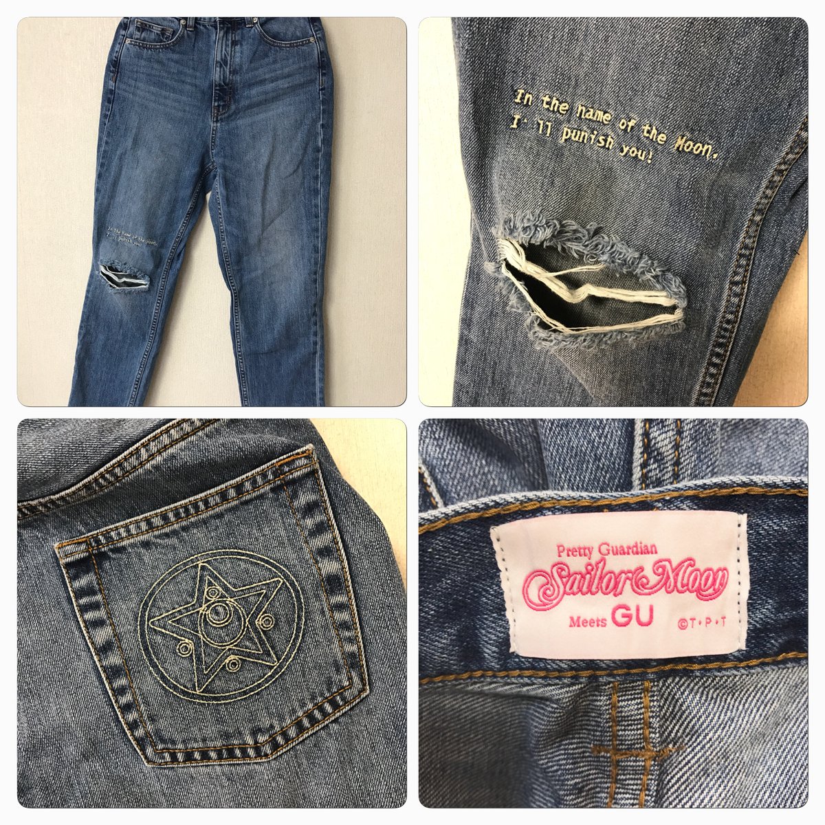 - Джинсы «Sailor Moon Model Jeans»: сделаны из джинсовой ткани. На правой штанине – дыра, над которой вышит знаменитый слоган СМ«In the name of the Moon, I’ll punish you!». На заднем кармане – вышивка в форме броши Кристальной Звезды. Выйдут в 2 вариантах – светло-синем и тёмно-синем. Цена – 2490 йен.