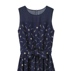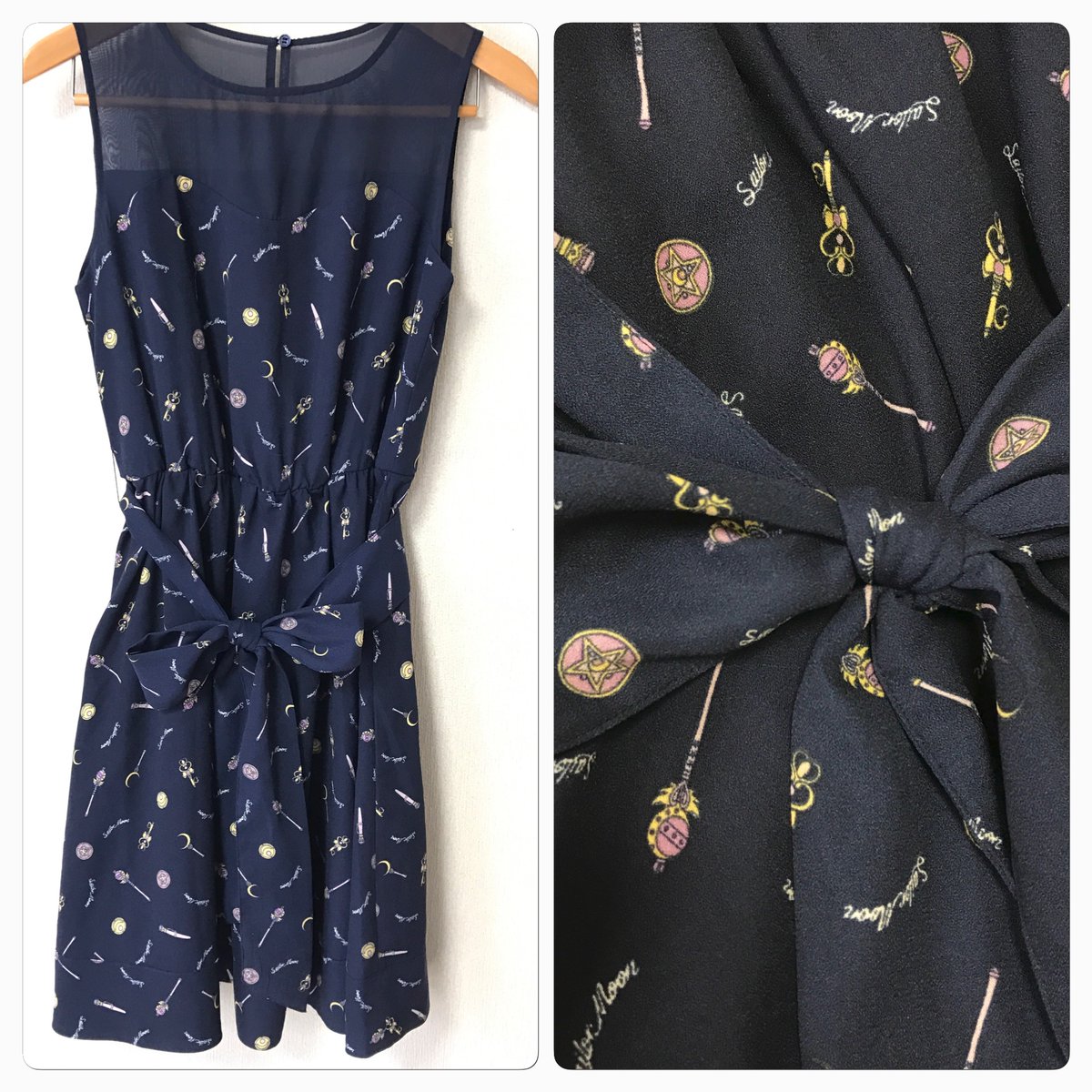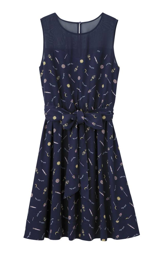 - Платья «Transformation Items Print Dress»: выйдут в 2 вариантах – белом и тёмно-синем. Область плеч сделана из шифона. Принт – волшебные предметы СМ, Ключ Пространства-Времени Чибиусы, полумесяцы и надпись «Sailor Moon». Цена – 2490 йен.