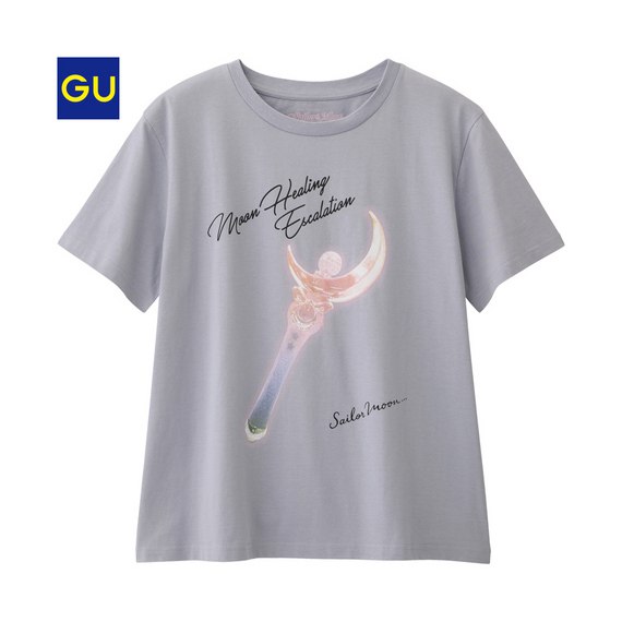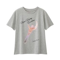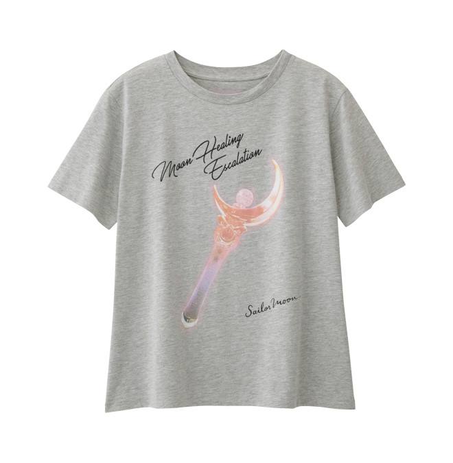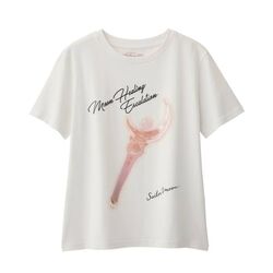- Футболки «Moon Stick Photo Print T-Shirt»: в качестве принта использован силуэт Лунной Палочки из 1 сезона и надписи – «Moon Healing Escalation» и «Sailor Moon». Выйдут в 3 цветовых вариантах – белом, светло-сером и тёмно-сером. Цена – 790 йен.