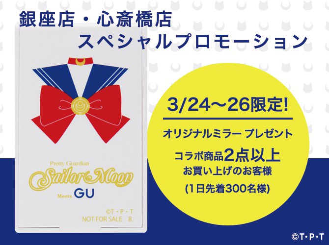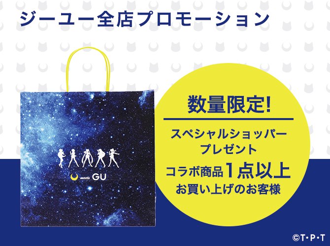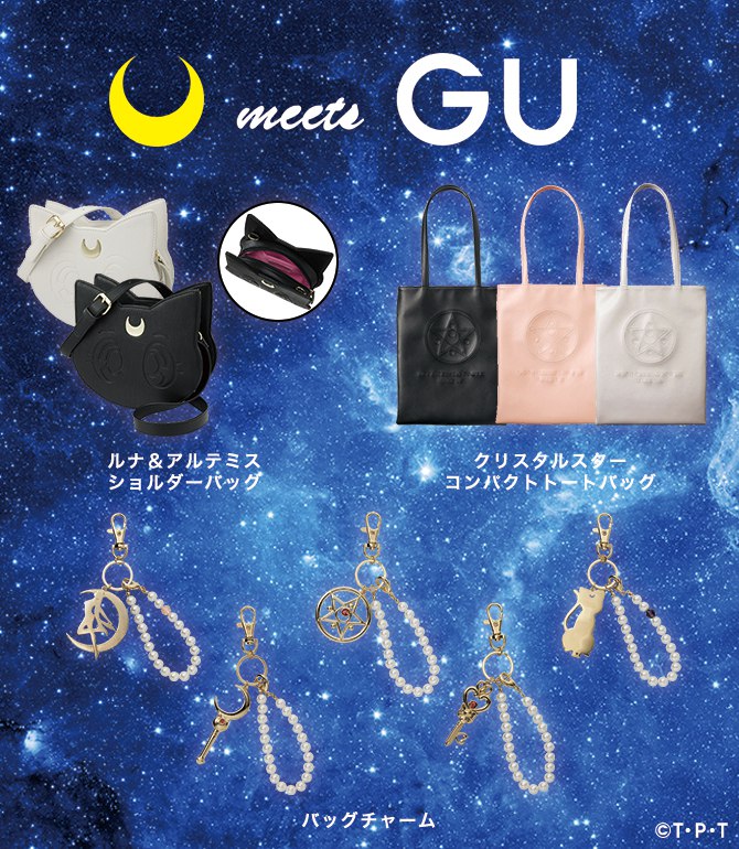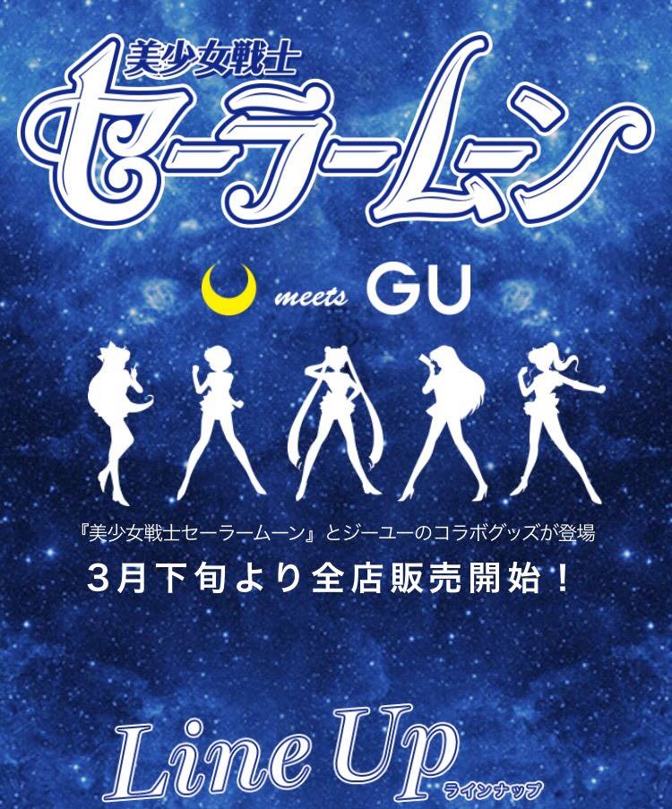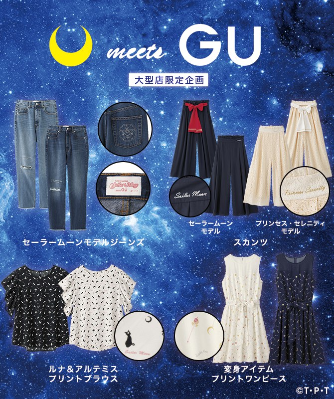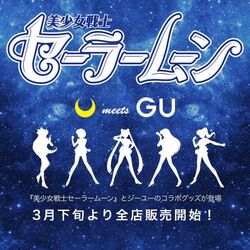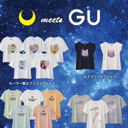 Как уже было упомянуто ранее, в связи с празднованием 25-летия СМ, 25 января было объявлено о серии сотрудничеств, приуроченных к данному событию. Среди них было анонсировано сотрудничество с фирмой «GU», подробности которого обещались к публикации на официальном сайте позднее. И вот, 3 марта, был опубликован список тематических товаров, выходящих в рамках данного сотрудничества в конце марта. Их перечень приведён ниже (модельный ряд будет пополняться):