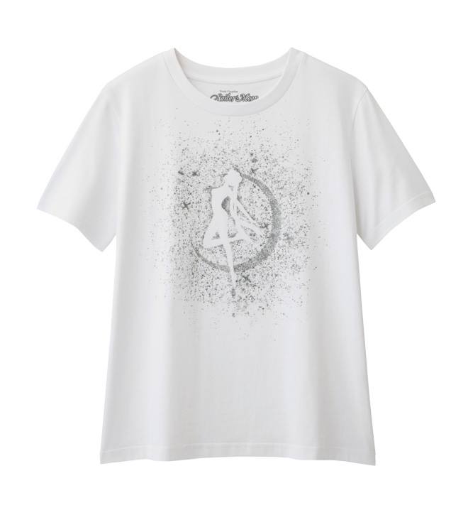 - Футболки «Sailor Warrior Logo Print T-shirt»: в линейке, как и в предыдущем случае, представлено 5 футболок, соответствующих внутренним сенши – белая (Мун), бледно-голубая (Меркурий), светло-красная (Марс), салатовая (Юпитер), светло-оранжевая (Венера). Принт на каждой футболке состоит из 2 элементов: банта с брошью определённой воительницы и её фразы для трансформации. Подол на спине удлинен. Цена – 790 йен.