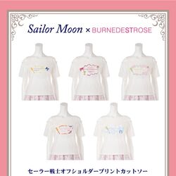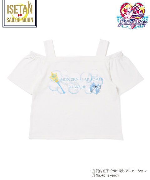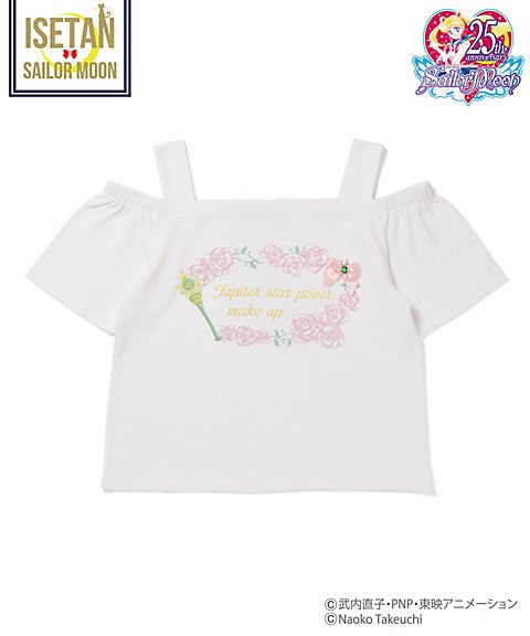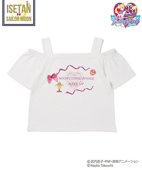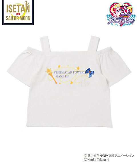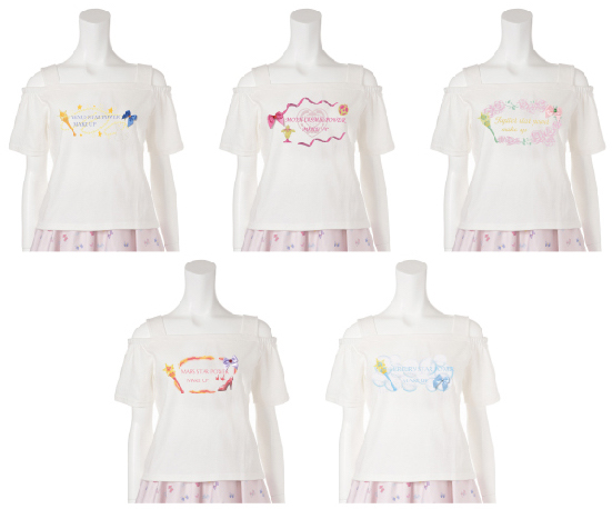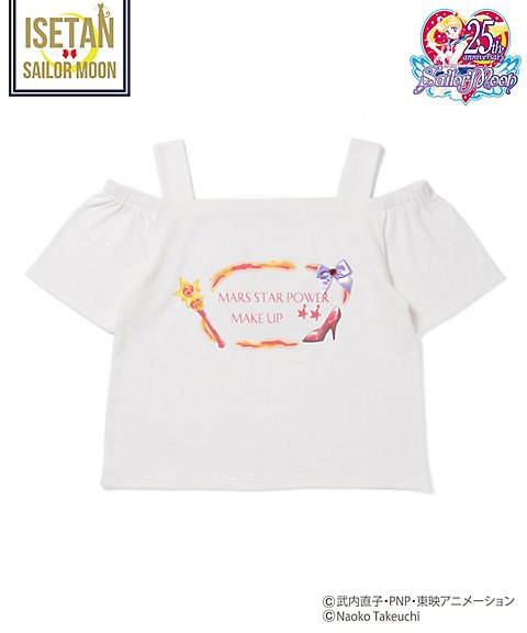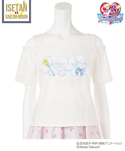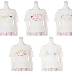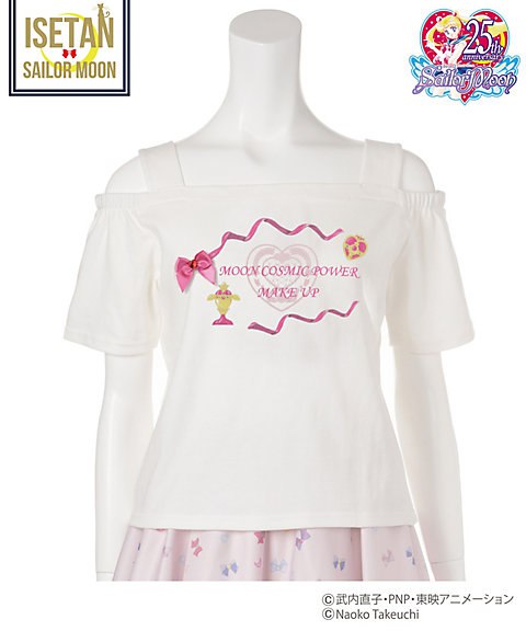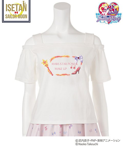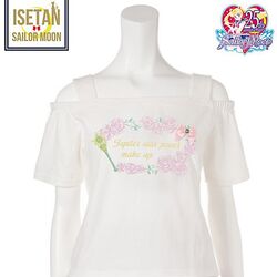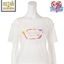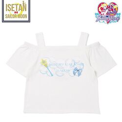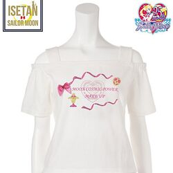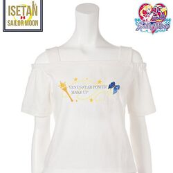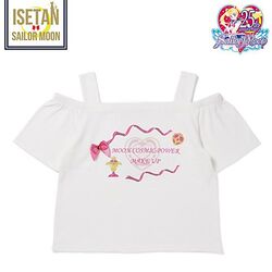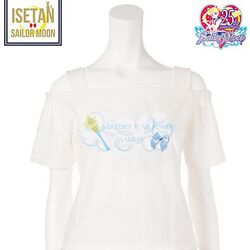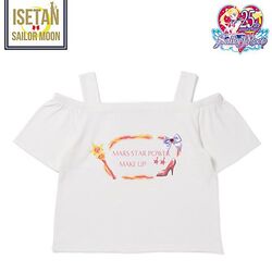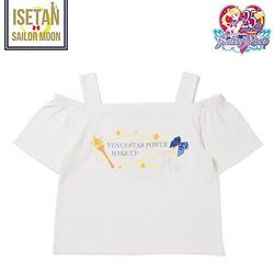 - Футболки с открытыми плечами «Sailor Senshi Off-Shoulder Print Cut-and-Sew»: благодаря толстым и широким лямкам они хорошо носятся и не спадают. Всего в линейке 5 футболок – по одной на каждую «внутреннюю» воительницу. Принт состоит из нескольких элементов - фразы для превращения, Жезла Звёздной Силы и тематического орнамента (Мун – брошь Космического Сердца, Грааль и ленты; Меркурий – орнамент в виде мыльных пузырей, Марс – языки пламени, серьги-звёзды туфля на каблуке, Юпитер – орнамент в виде розовых цветов, Венера – оранжевые звёзды) – и окрашен в соответствующие цвета. Каждая футболка декорирована небольшим атласным бантиком с кристаллом, выполненными в соответствующей цветовой гамме. Длина рукавов – 17 см, размер в талии – 84 см., длина футболок – 41 см. Цена за футболку – 11000 йен.