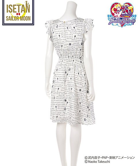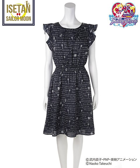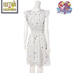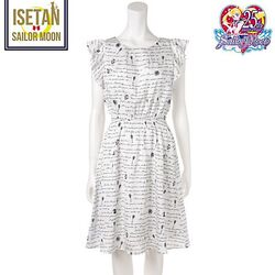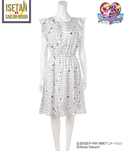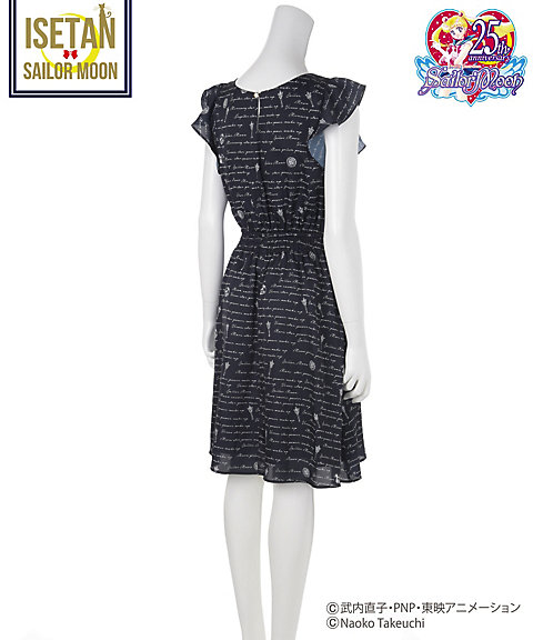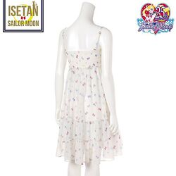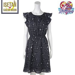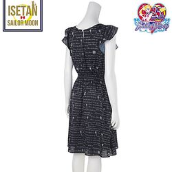 - Платья "Hand-drawn style print dress": выйдут в 2 вариантах – чёрном и белом. Принт на платьях – волшебные предметы внутренних сенши и Чибимун, а также их фразы для перевоплощения; стилизован под ручную роспись, цвет – чёрный (для белого платья)/белый (для чёрного). Всё это создаёт общую атмосферу ностальгии. Длиной платья – до коленок, размер в груди – 89 см., в талии – 62-90 см, общая длина платьев – 95 см. Цена за одно платье – 26000 йен.