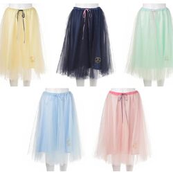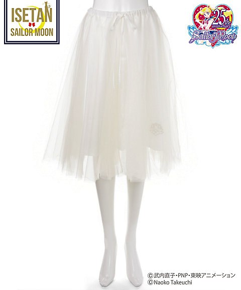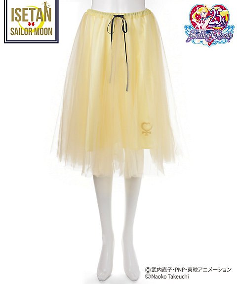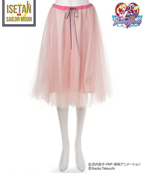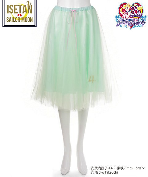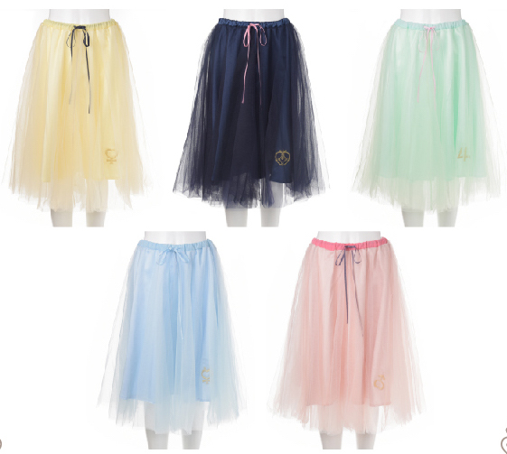 - Юбки «Sailor Senshi Tulle Skirt»: сделаны из двуцветного тюля, декорированы: в области талии ленточкой соответствующего цвета, в нижней левой части юбки - ближе к подолу - золотой вышивкой в форме символа броши/планеты. Размер юбок в талии – 62-90 см., общая длина каждой юбки – 63 см., длина подкладки – 56 см. Цена за юбку – 17000 йен. Всего в линейке – 5 моделей:
