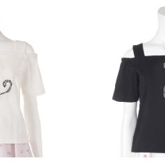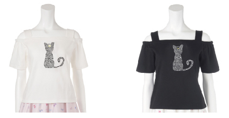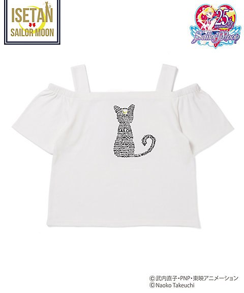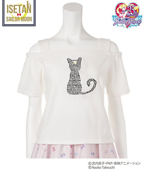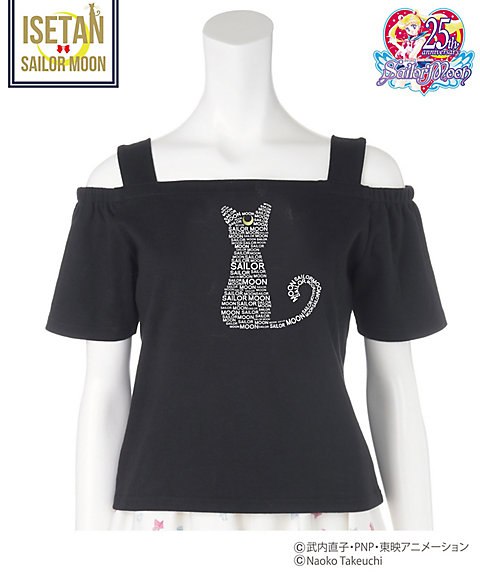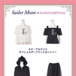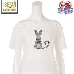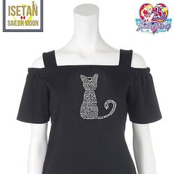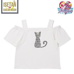 - Футболки с открытыми плечами «Luna or Artemis Off-Shoulder Print Cut-and-Sew»: чёрная и белая футболки, соответствующие лунным кошкам, с толстыми и широкими лямками, которые помогают им не спадать при ношении. Принт – фигурки Луны (на белой футболке) и Артемиса (на чёрной), составленные из слова «Sailor Moon». Длина рукавов – 17 см., размер в талии – 84 см., общая длина футболок – 41 см. Цена за футболку – 11000 йен.