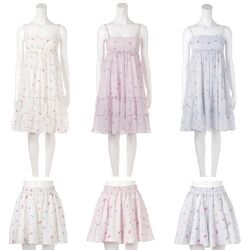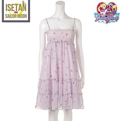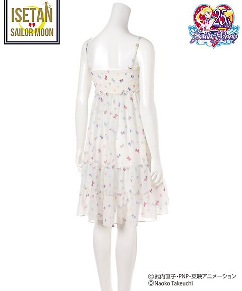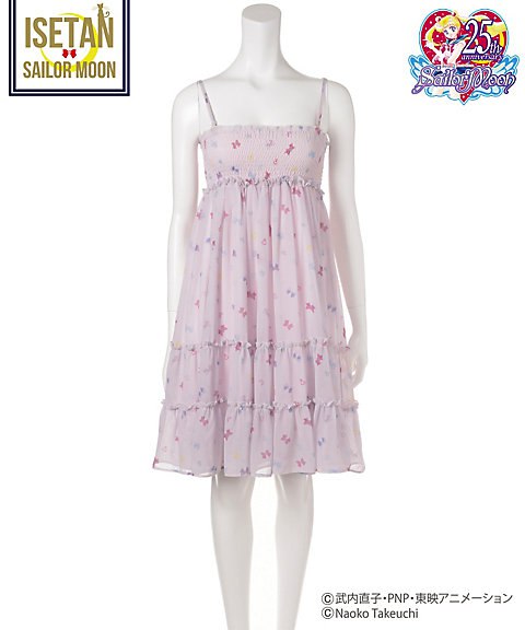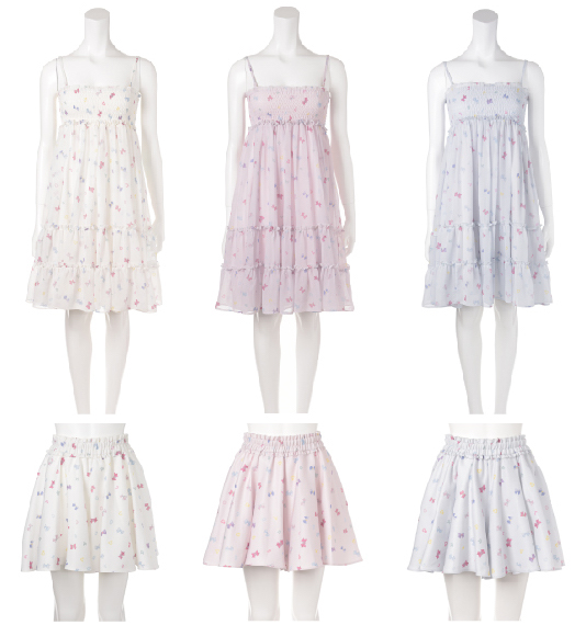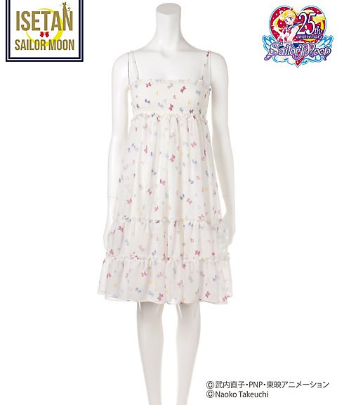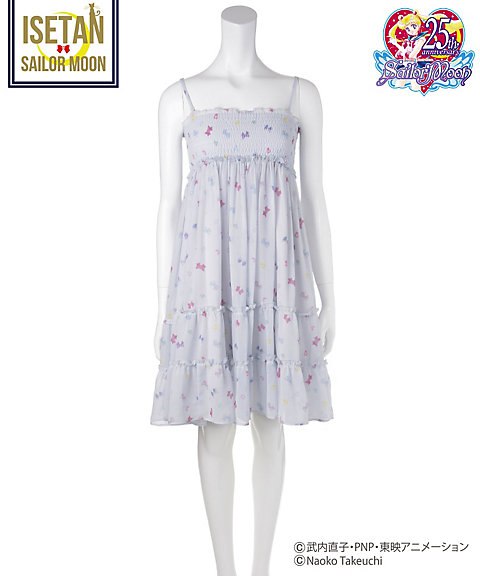 - Платья и юбки «Ribbon Pattern Dress/Culottes»: выйдут в 3 цветовых вариантах – белом, бледно-синем и бледно-розовом. Узор – символы планет «внутренних» воительниц и Чибимун, и банты с брошками. Размеры платьев: в груди – 54-90 см., в талии – 54-90 см., длина платьев – 72 см. Размеры юбок: в талии – 60-88 см., размер внутреннего шва-10 см. Цена за платье – 22000 йен. Цена за юбку – 16000 йен.