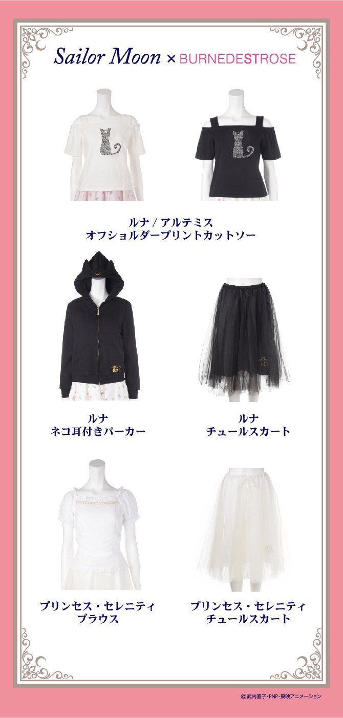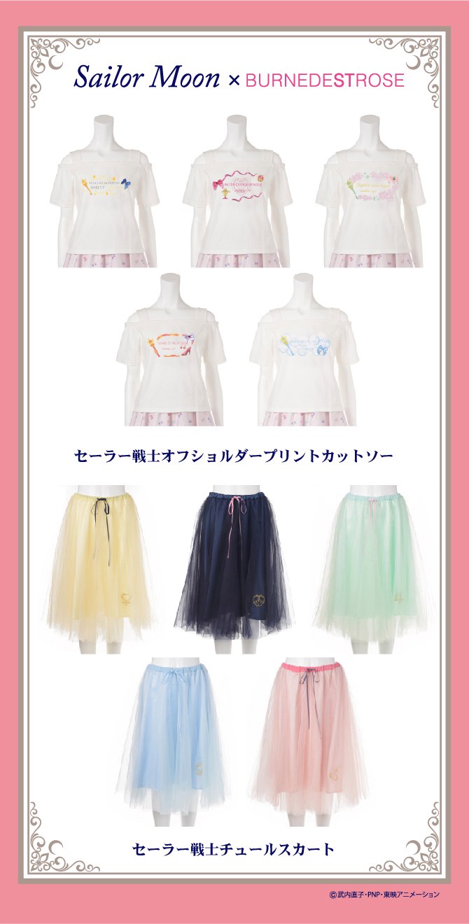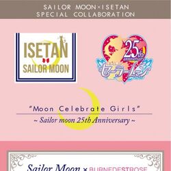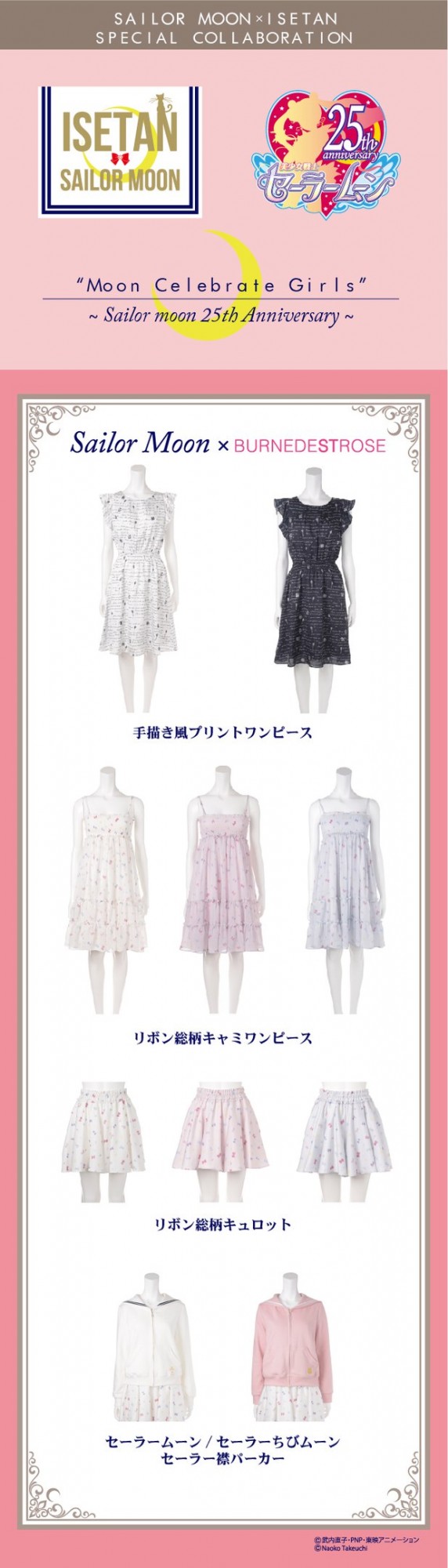 Как уже упоминалось ранее, в связи с празднованием 25-летия появления СМ, было принято решение о проведении нескольких сотрудничеств среди которых был анонсирован уже 3 общий проект СМ и магазинов «ISETAN», получивший название ~Moon Celebrate Girls~. В число ранее упомянутых брендов, помимо «Samantha Tabita» и «Anna Sui», также вошёл «BURNEDESTROSE», специализирующийся на выпуске модной одежды. В рамках сотрудничества СМ и данного бренда будет выпущено несколько вариантов платьев, юбок и ветровок. Их перечень выглядит следующим образом: