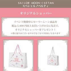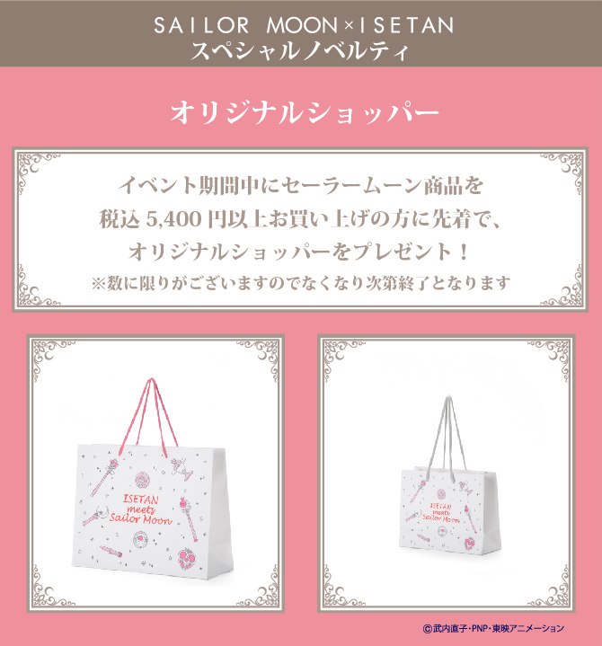 Помимо этого, в период проведения данного сотрудничества, первым покупателям, при покупке более чем на 5400 йен, в качестве подарка, предназначается сумка с принтом - волшебные предметы СМ из первых 3 сезонов, звёзды и розовая надпись «ISETAN meets Sailor Moon». Сумка будет выпущена в 2 вариантах: большая, с розовыми ручками, и маленькая – с белыми. При этом: