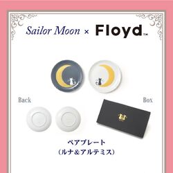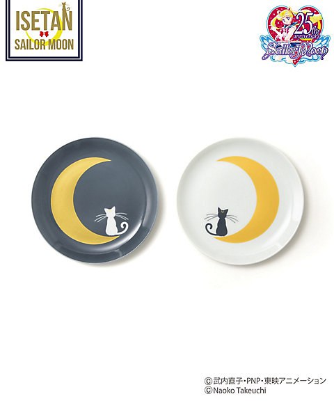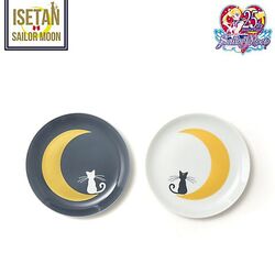 - Парные тарелки ‘Luna & Artemis’: как и вышеописанные тарелки и чашки, сделаны из фарфора чёрного и белого цветов. Принт – Луна/Артемис, сидящая (ий) на полумесяце. Могут быть использованы, как в качестве обычной посуды, так и в качестве предметов интерьера. Упакованы в длинную чёрную коробку с золотым рисунком в форме силуэтов лунных кошек. Цена за набор – 7800 йен.