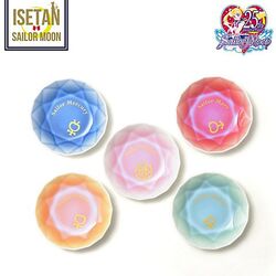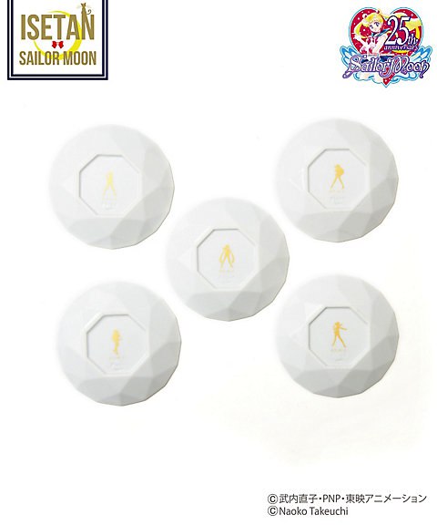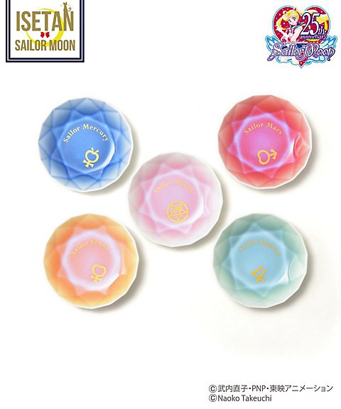 - Тарелки «Jewel Plate Set ‘5 Sailor Senshi’»: сделаны из фарфора с применением технологии «кристаллическая глазурь» - она делает глазурь прозрачной, подобно кристаллу и придаёт изделию дополнительный блеск. Данные тарелки можно использовать как в качестве обычной посуды, так и для размещения на ней украшений и аксессуаров. Каждая будет упакована в белую коробку с золотистым рисунком в форме силуэтов сенши и логотипом «Sailor Moon». Цена за тарелку – 10000 йен. Всего в линейке – 5 тарелок, соответствующих «внутренним» сенши:
