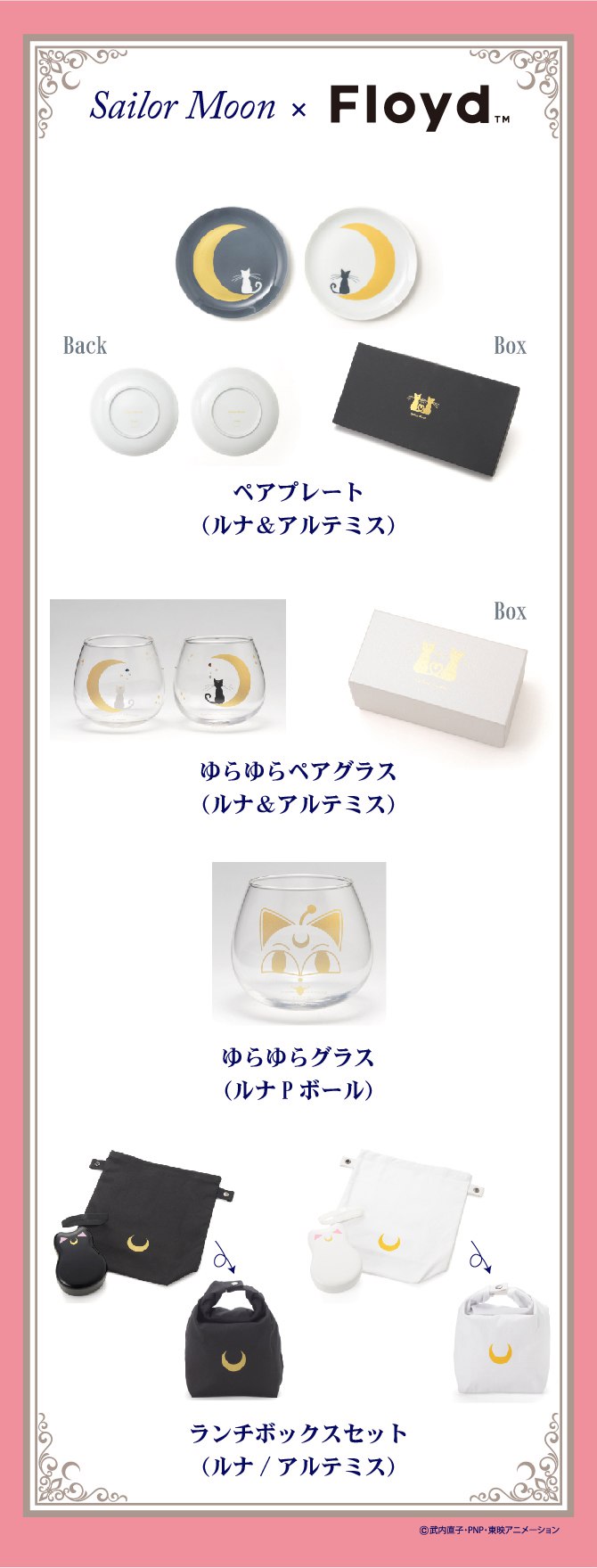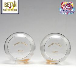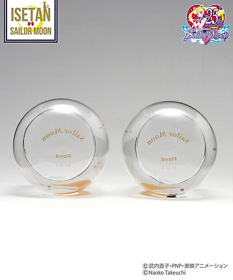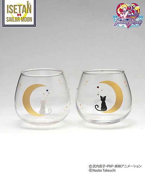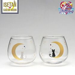 - Качающиеся парные стаканы « ‘Luna & Artemis’»: сделаны из японского стекла. Принт – силуэт Луны/Артемиса на полумесяце и звёзды. Декорированы кристаллами. На дне стаканов – логотип«Sailor Moon». Упакованы в белую коробочку с золотым рисунком в форме силуэтов лунных кошек. Цена набора – 5000 йен.