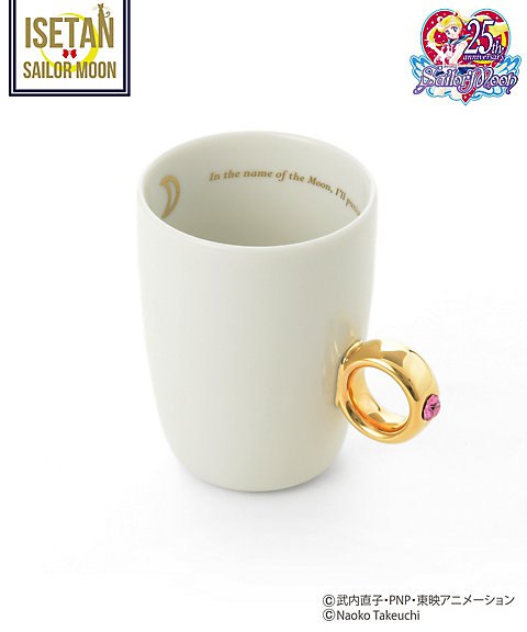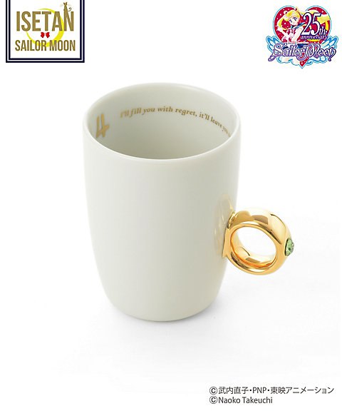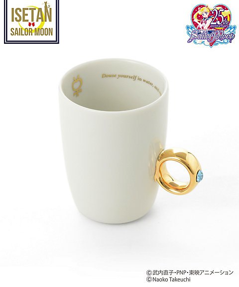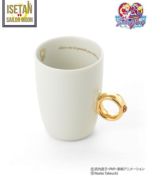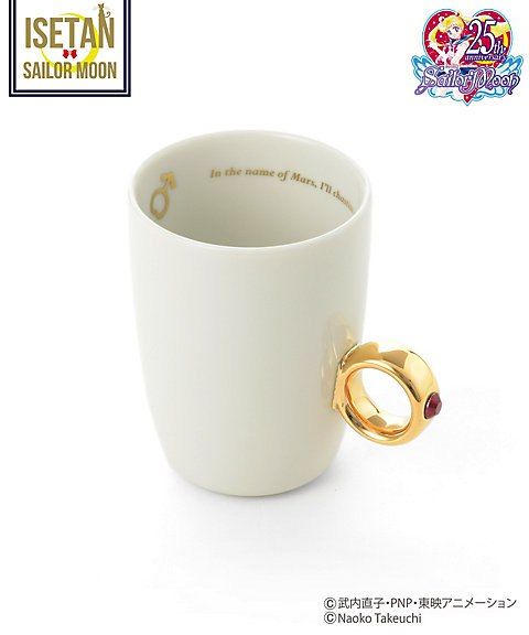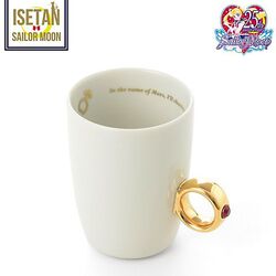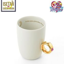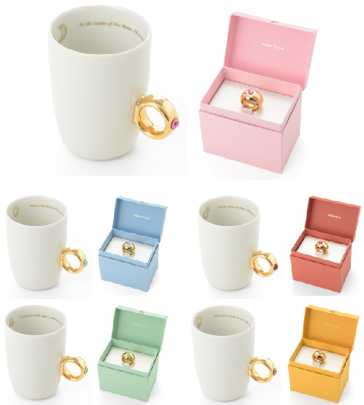 - Кружки «Sailor Senshi Cup Ring»: состоят из 2 отдельных элементов: непосредственно самой кружки, сделанной из фарфора, и ручки к ней. Выполнены в стиле «внутренних» сенши: на внутренней стороне кружки, по кайме – золотистые слоган той или иной сенши и её планетарный символ; ручка для кружки идёт отдельно, стилизована под золотистое кольцо и украшена кристаллом «Сваровски», цвет которого соответствует той или иной сенши. Оба элемента упакованы в коробочку соответствующего цвета. Цена за кружку с ручкой-кольцом 4800 йен.