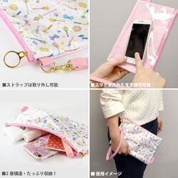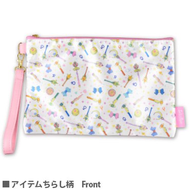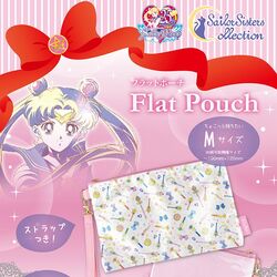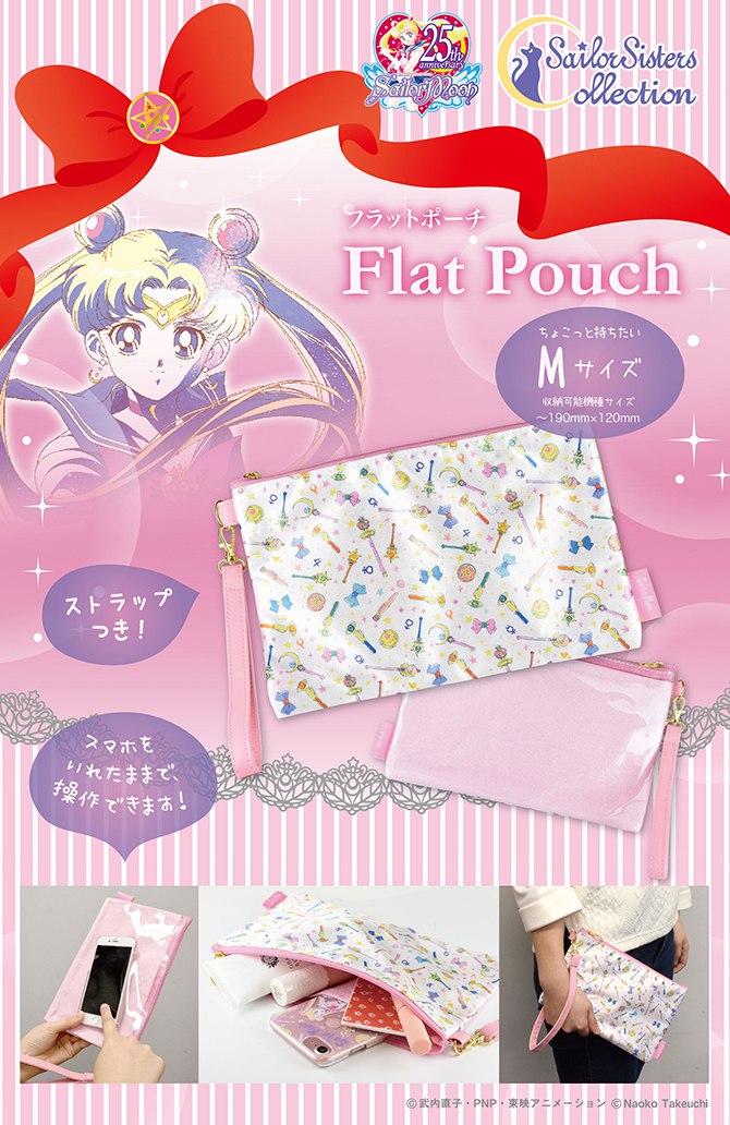 Сумочка «Sailor Moon Flat Pouch», объявленная первой, сделана из блестящей сатиновой ткани, принт – волшебные предметы «внутренних» сейлор-воительниц, символы их планет и звёзды. Прозрачный кармашек сделан из пластика, который реагирует на прикосновения, благодаря чему со смартфоном можно работать, не вынимая его из сумочки. Также сумка имеет ремешок на запястье. В ней можно хранить как смартфон, так и различные мелкие вещи. Релиз назначен на конец мая. Цена – 2894 йены.