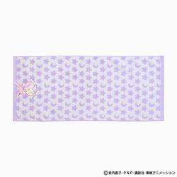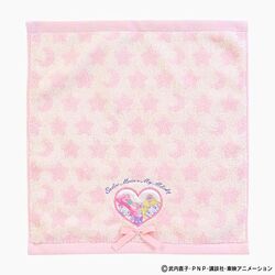 - Полотенца (3 вида): сделаны из пушистой, нескрученной пряжи, которая удобна в использовании. Декорированы сатиновой аппликацией, вышитым логотипом и бантом. Всего будет 3 вида: бледно-голубое полотенце с сиреневой аппликацией, полотенце в бледно-голубую и розовую полоску с сиреневой и розовой аппликациями, бледно-розовое полотенце с розовой аппликацией. Цена полотенца для лица – 1000 йен, полотенца для рук – 700 йен, маленького полотенца – 600 йен.