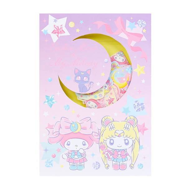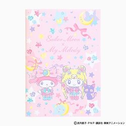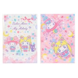 - Канцелярские товары (4 вида): 2 блокнота (обычный и мини), папки для файлов и декоративные наклейки. Блокноты и файлы – белого и розового цветов с артами к сотрудничеству и мелким принтом, упаковка для наклеек сиренево-белого цвета с мелким принтом в форме звёзд и артом к сотрудничеству с СМ, ММ и Луной на «окошке» - полумесяце. Цена всех товаров – 400 йен.
