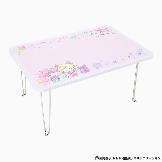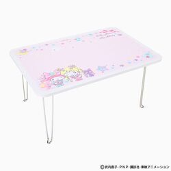 - Столик для комнаты: прямоугольного типа, размеры – 60 см. х 40 см. Основная часть столешницы – бледно-сиреневого цвета, по краям – принт, основанный на дизайне для сотрудничества (логотип, фигурки ММ, Луны и СМ и многочисленные мелкие узоры). Цена – 3500 йен.
