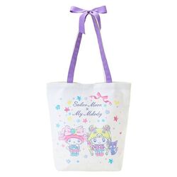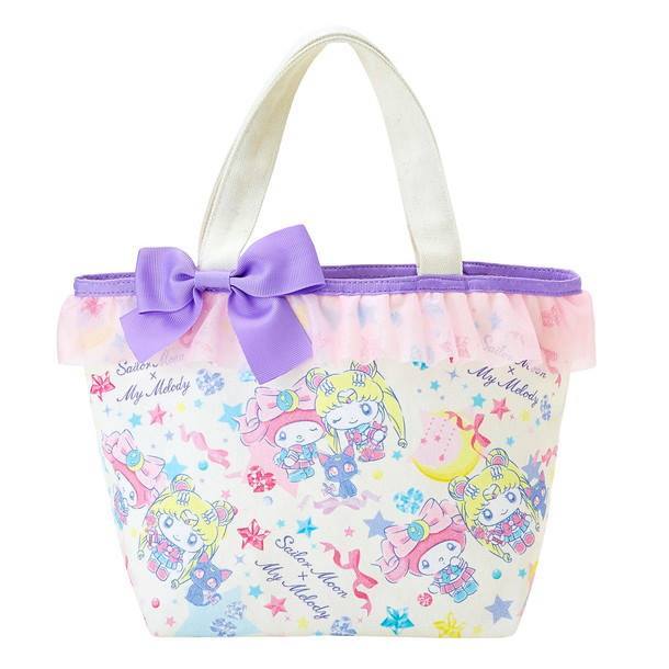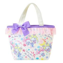 - Сумки (2 вида), косметичка, ключница, пенал: большая сумка – белого цвета, с бело-фиолетовыми ручками, которые декорированы бантами и артом сотрудничества; маленькая сумочка – белого цвета, с артами сотрудничества и множеством мелких узоров (звёзды, ленты и т.д.), декорирована фиолетовым бантом и розовыми оборками. Косметичка, ключница и пенал – нежно-голубого цвета, с артами сотрудничества и множеством мелких узоров, декорированы ушками (символ ММ) и бантом с брошкой (символ СМ). Все вещи сделаны из кожи. Цена большой сумки – 2500 йен, маленькой сумочки – 2000 йен, косметички – 1800 йен, ключницы – 1200 йен, пенала – 1800 йен.