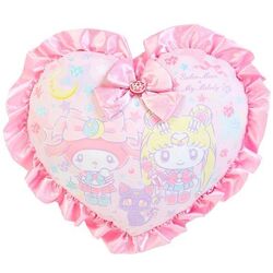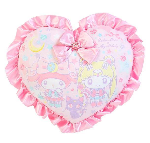- Подушка: выполнена в форме сердца, декорирована розовым бантом с брошью и такого же цвета рюшами. Сама подушка – бледно-розового цвета, с изображениями ММ, Луны, СМ и мелким принтом. Цена – 2800 йен.
