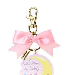 - Акриловый брелок: состоит из розового банта, пластинки с принтом, изображающим Луну на полумесяце и логотип сотрудничества, и 2 подвесок – с ММ и СМ. Является своеобразной вариацией плюшевых талисманов из 1 пункта. Цена – 1200 йен.