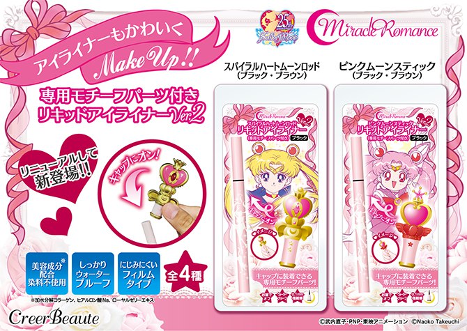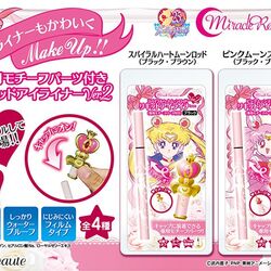 Вторыми в линейке «MiracleRomance» были анонсированы очередные подводки для глаз на жидкой основе. На этот раз их колпачки выполнены в форме жезлов Мун и Чибимун из 3 сезона – Heart Moon Rod и Pink Moon Stick. Цвет подводок – коричневый.