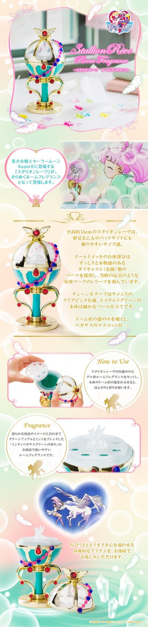 Вчера же, 31 мая, «Premium Bandai» анонсировали очередной ароматизатор для комнат – «Stallion Reve Fragrance», выполненный в форме чаши, через которую Чибиуса контактировала с Пегасом.