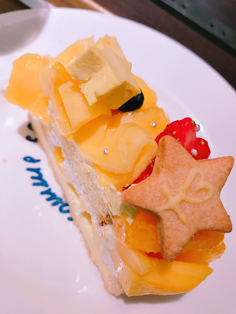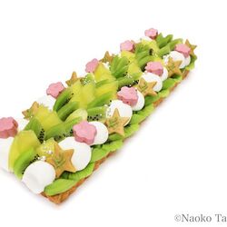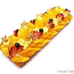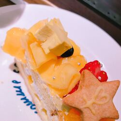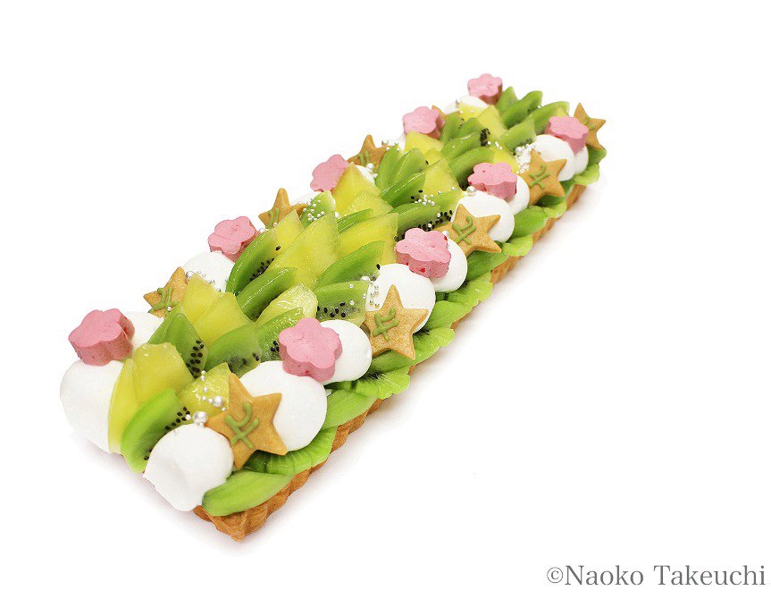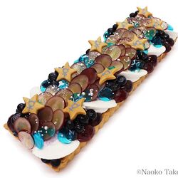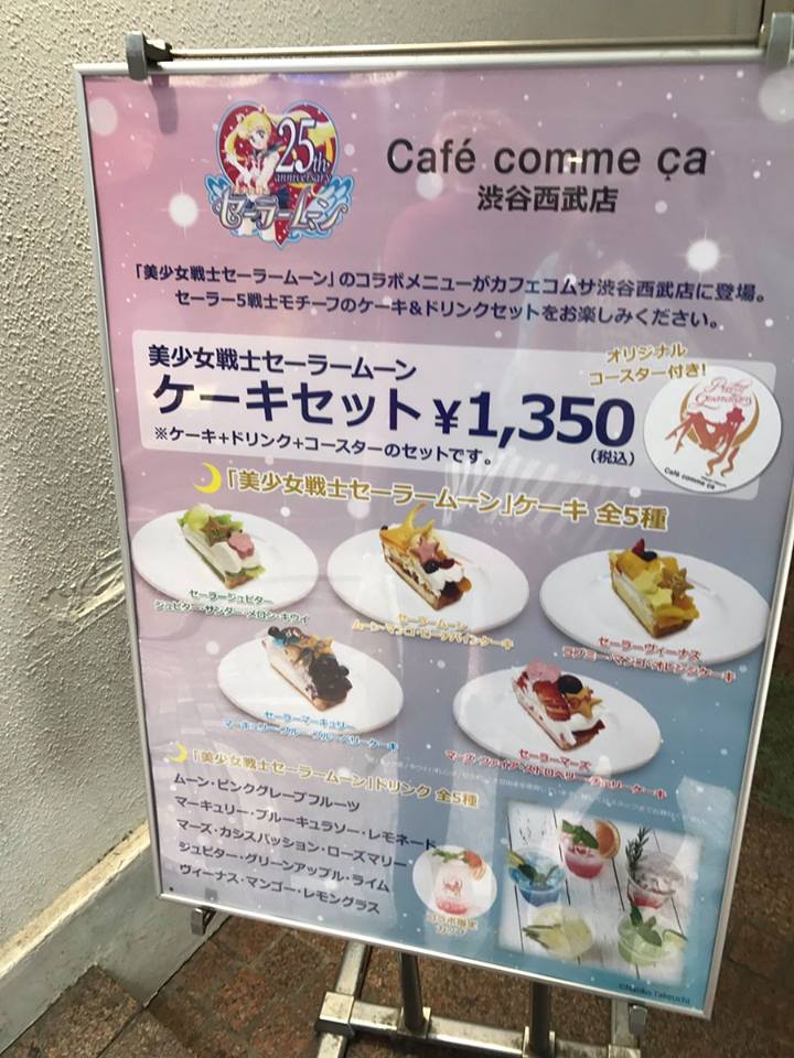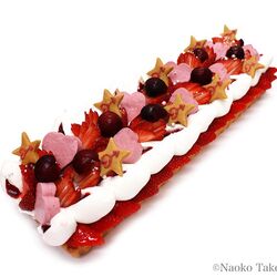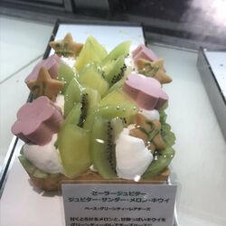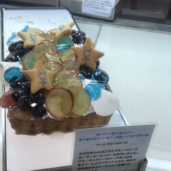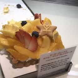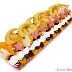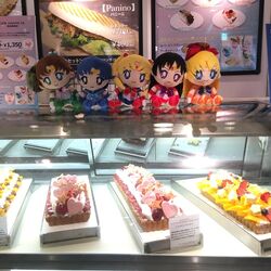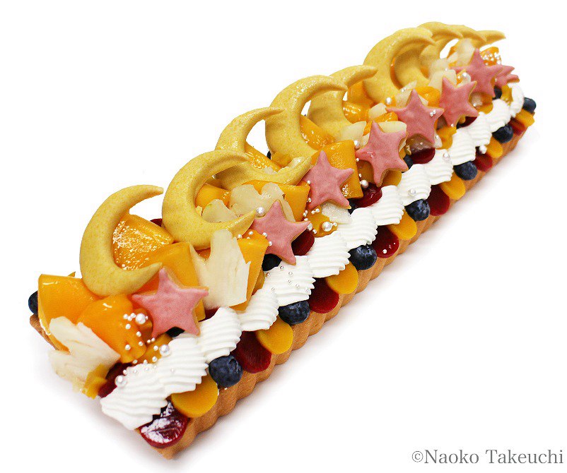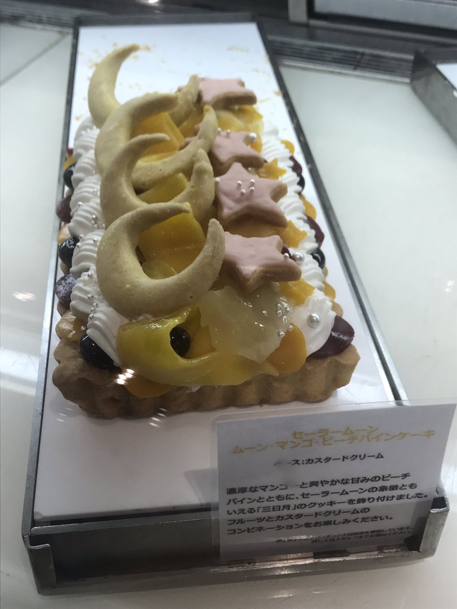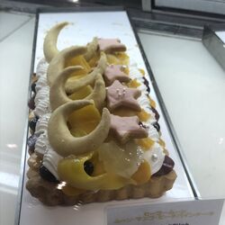 - Сейлор Мун: пирожное с ананасами, персиками, манго и черникой; украшено печеньями в форме полумесяцев. Дополнено заварным кремом и сахарными бусинами.
