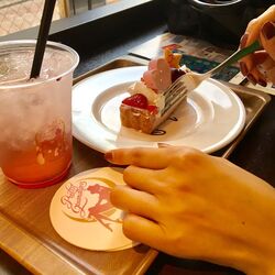 Всем заказавшим пирожное и напиток в подарок полагалась подставка-костер, с логотипом фан-клуба. Цена пирожного, напитка и подставки вместе – 1350 йен.