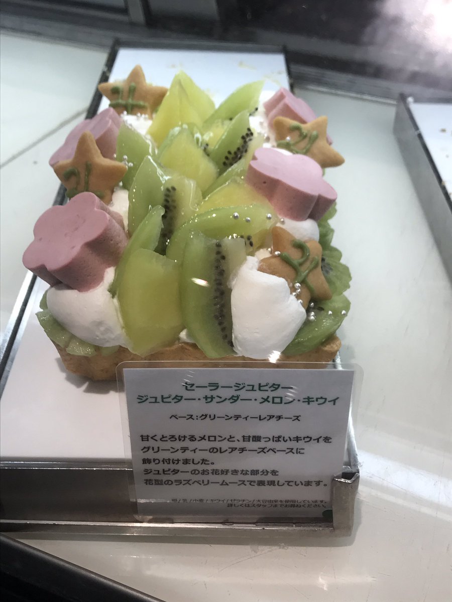 - Сейлор Юпитер: дынное пирожное с кисло-сладким киви. Дополнено малиновым муссом в форме цветов, редким сортом сыра, который является «основой» пирожного, зелёным чаем, печеньями в форме звёздочек с символом Юпитера и сахарными бусинами