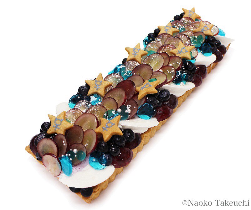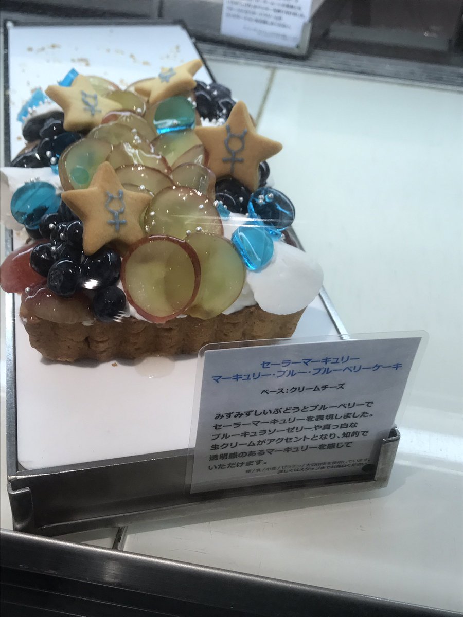 - Сейлор Меркурий: черничное пирожное с виноградом. Дополнено синим желе, взбитыми сливками, печеньями в форме звёздочек с символом Меркурия и сахарными бусинами