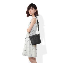 - Круглая сумка-ведро – укомплектована ремешком через плечо и удобной ручкой для ношения сумки в руке. Оба варианта декорированы ушками и металлическими полумесяцами золотистого цвета. Размер – 20 см. х 20 см. х 13 см., ручки – 38 см. Цена – 7800 йен.